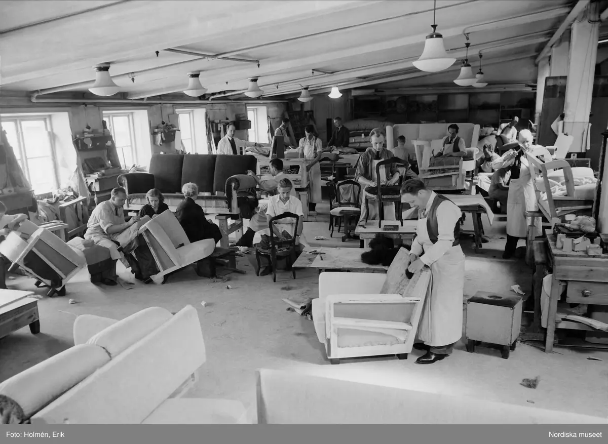 Nordiska Kompaniets tapetserarverkstad. Män och kvinnor klär om möbler.