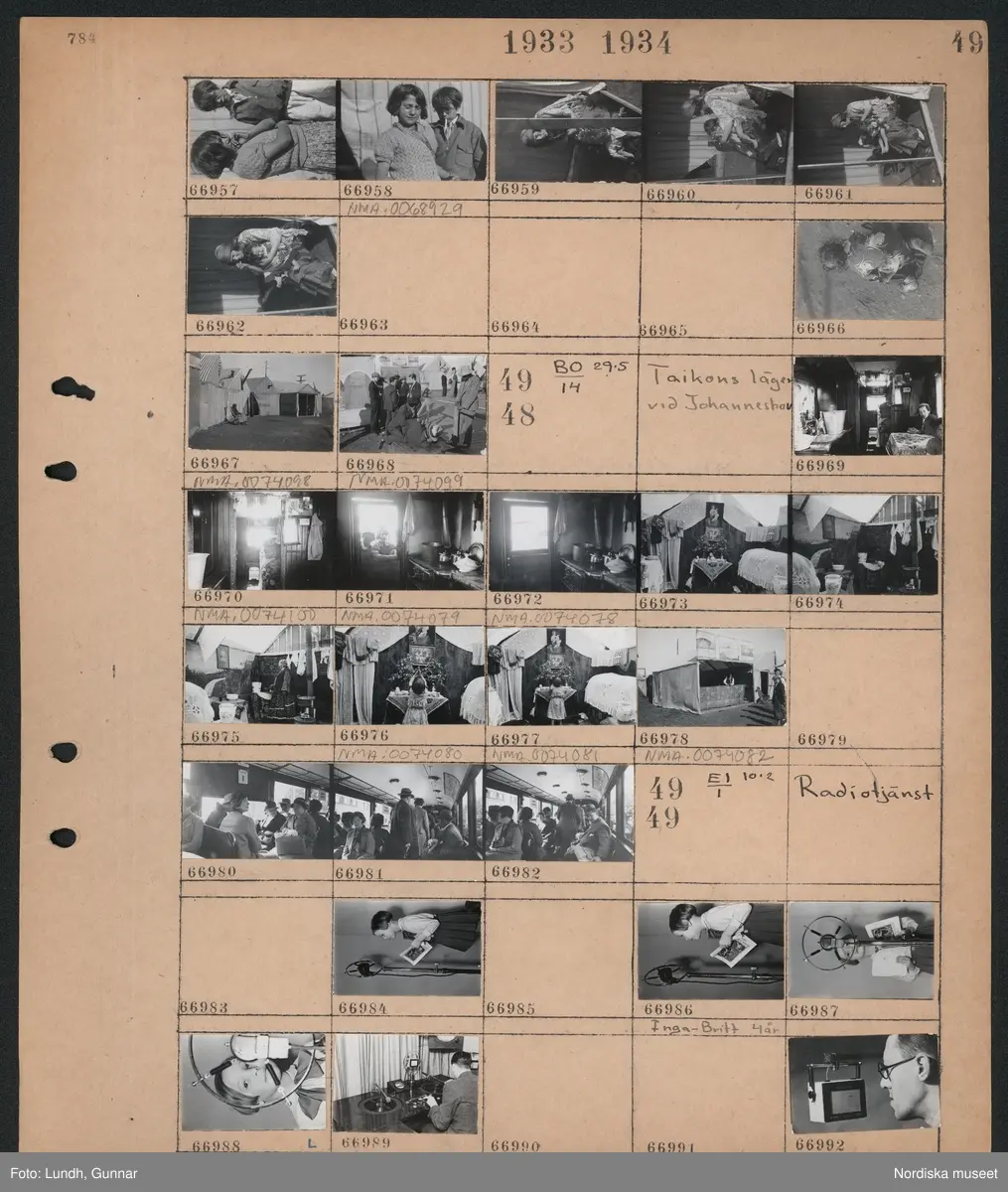 Interiör av ett tält, en vedspis i ett tält, ett barn i ett tält, interiör av en rälsbuss med passagerare.