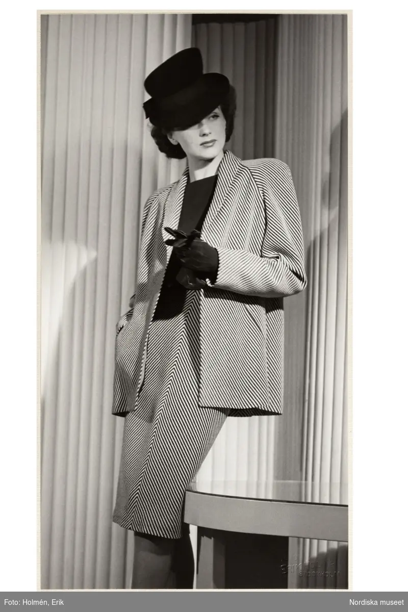 Mannekäng, Hjördis Genberg, poserar iklädd dräkt med vid kavaj och pennkjol i diagonalrandigt tyg. Enfärgad överdel, hatt och handskar. NK:s Franska damskrädderi.