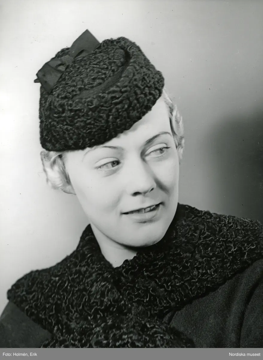 Kvinnlig modell i hatt från Rose Descat. Nordiska Kompaniet, Stockholm.