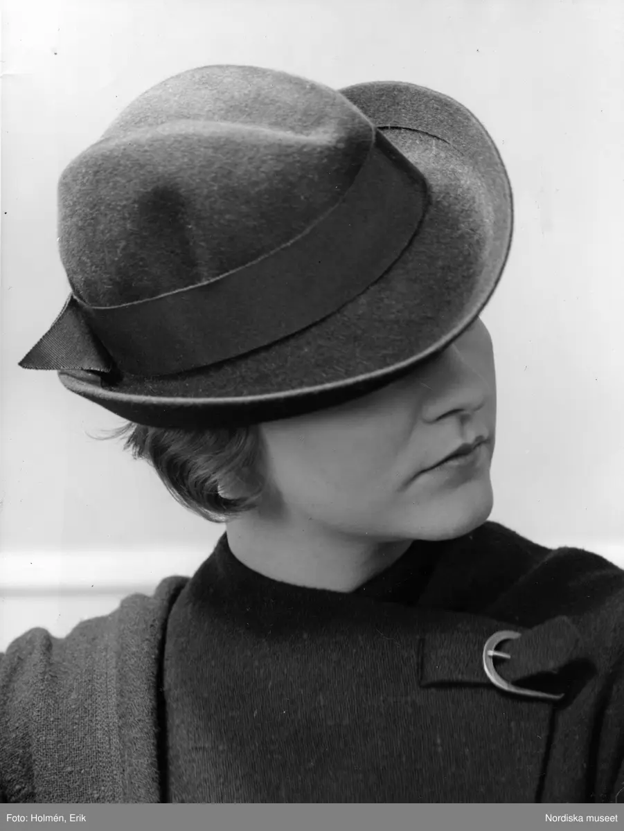 Kvinnlig modell i hatt från Jean Patou. Nordiska Kompaniet, Stockholm.