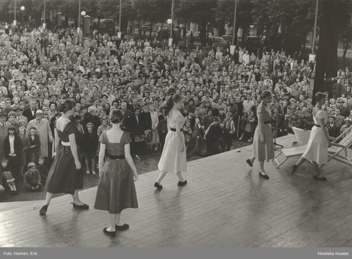 Lia Selmbert-baletten uppträder i Kungsträdgården i Stockholm, Nordiska Kompaniet. Modeller i klänningar med svart skärp.