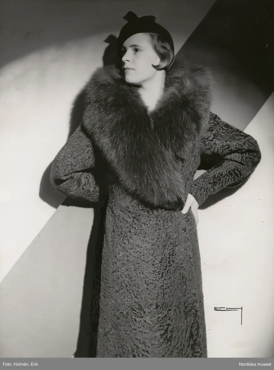 Nordiska Kompaniet. Kvinna i mörk persianpäls med stor krage av annan päls.