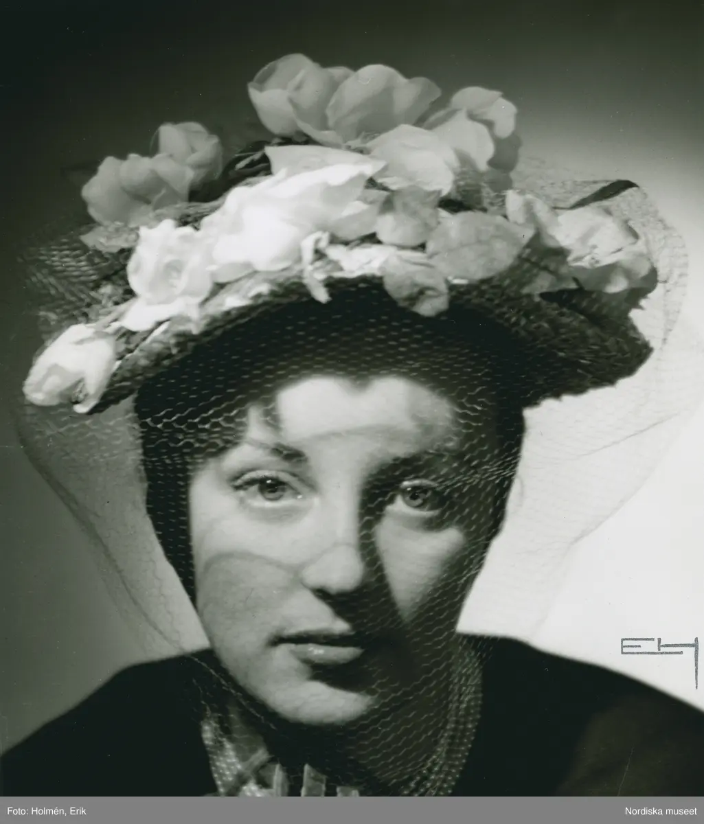 Porträtt av kvinna med halmgul stråhatt dekorerad med nyponblom och flor. Modell från Madame Paulette.