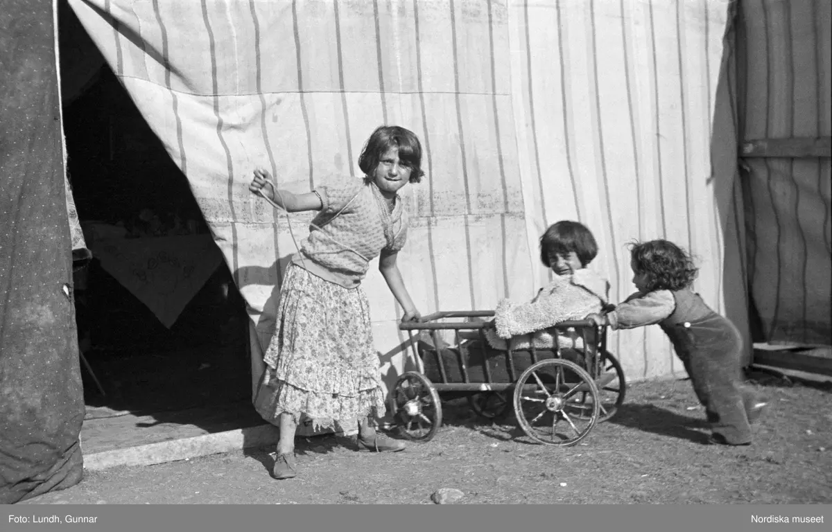 Tre barn leker med en vagn/skrinda. Den äldsta flickan ser in i kameran. Familjen Taikons läger i Johanneshov, södra Stockholm.