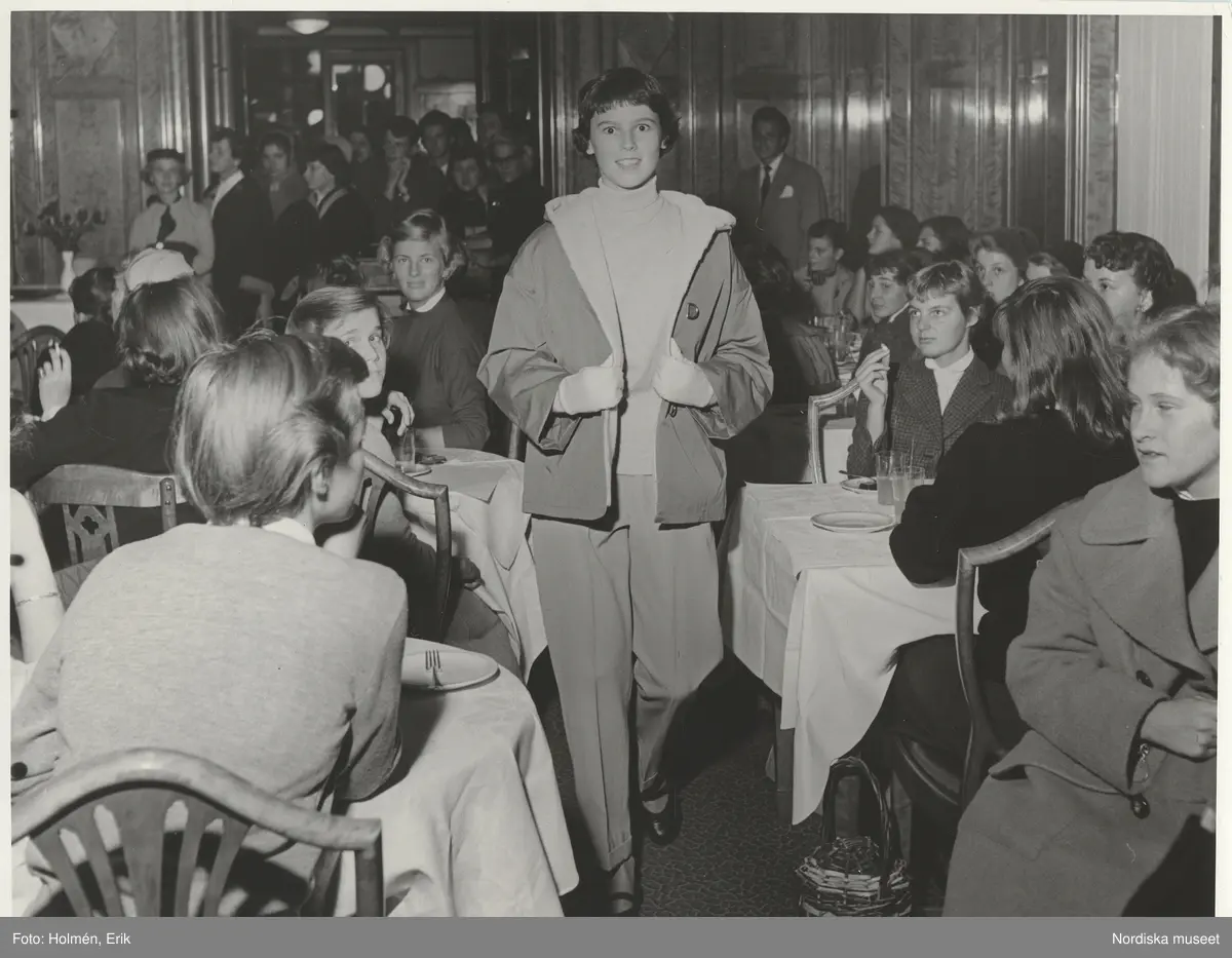 Tonårsmodevisning. Modell i polotröja, fodrad jacka och byxor. Publik sitter vid bord.