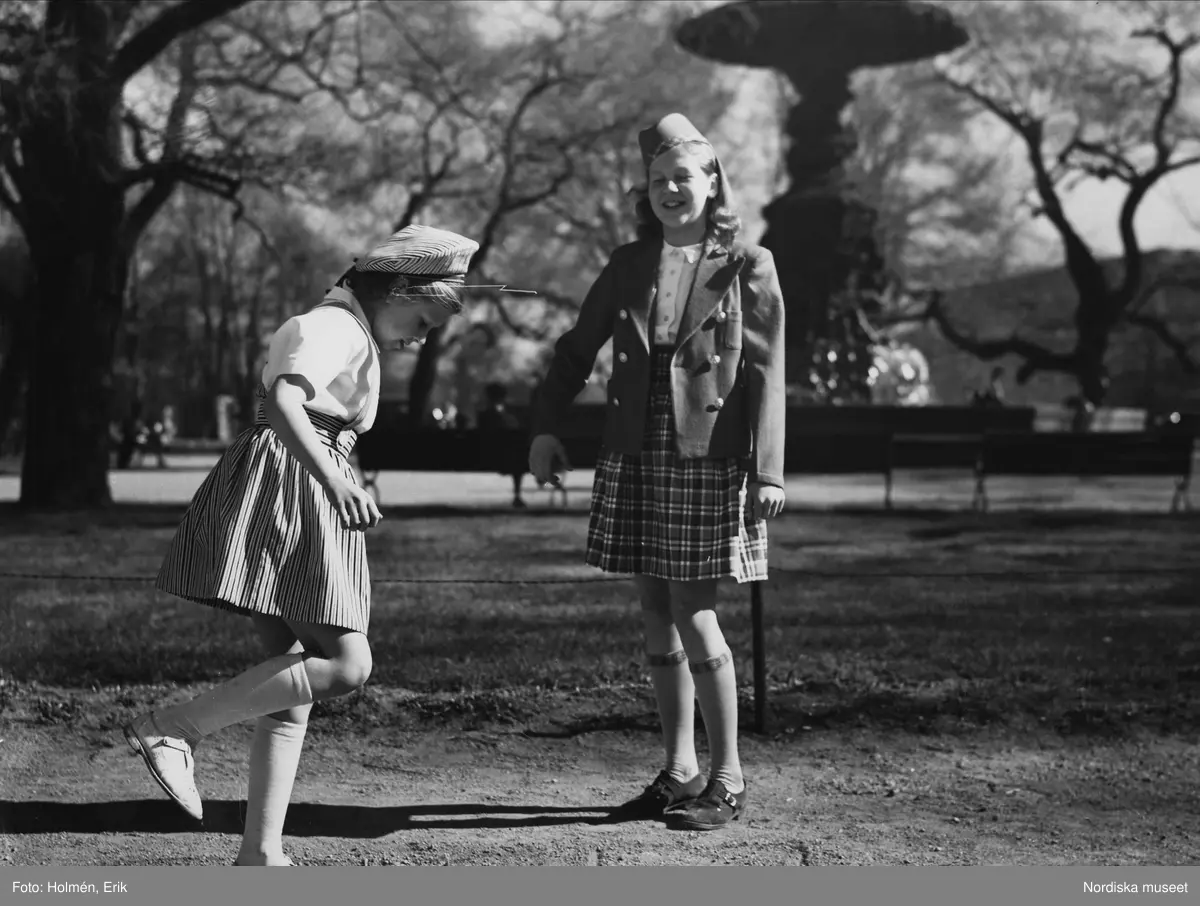 Flickor hoppar hage. Reklambild för barnkläder 1941. Nordiska Kompaniet.