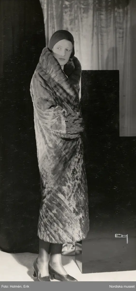 Nordiska Kompaniet. Kvinna i diagolnalmönstrad päls med bred och hög krage. Text på baksidan: "Zobelfärg. Hermelin 4.200."