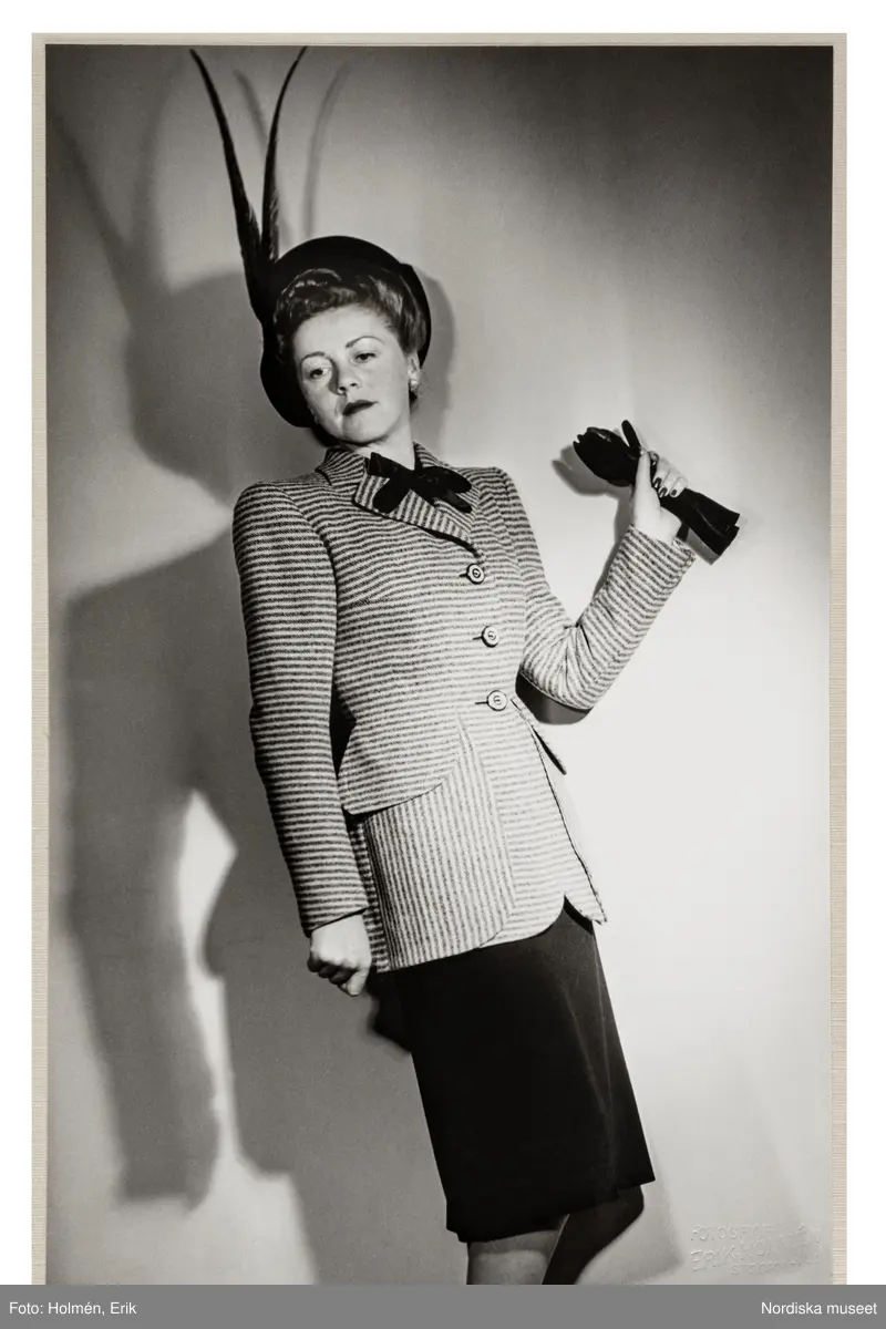 Modell poserar i lång, figurysdd dräktjacka av smalrandigt tyg. Mörk pennkjol, rosett i halsen, handskar och liten hatt med fasanfjädrar. NK:s Franska damskrädderi.