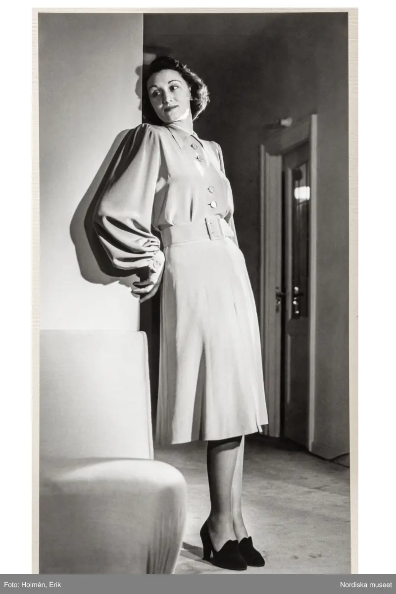 Mannekäng visar plagg i provrum. Klänning med blusliv, liten krage, knäppning och lång, vid ärm med manschett. Brett skärp markerar midjan. Knälång kjol med nedsydda veck. Pumps med medelhög klack. NK:s Franska damskrädderi.