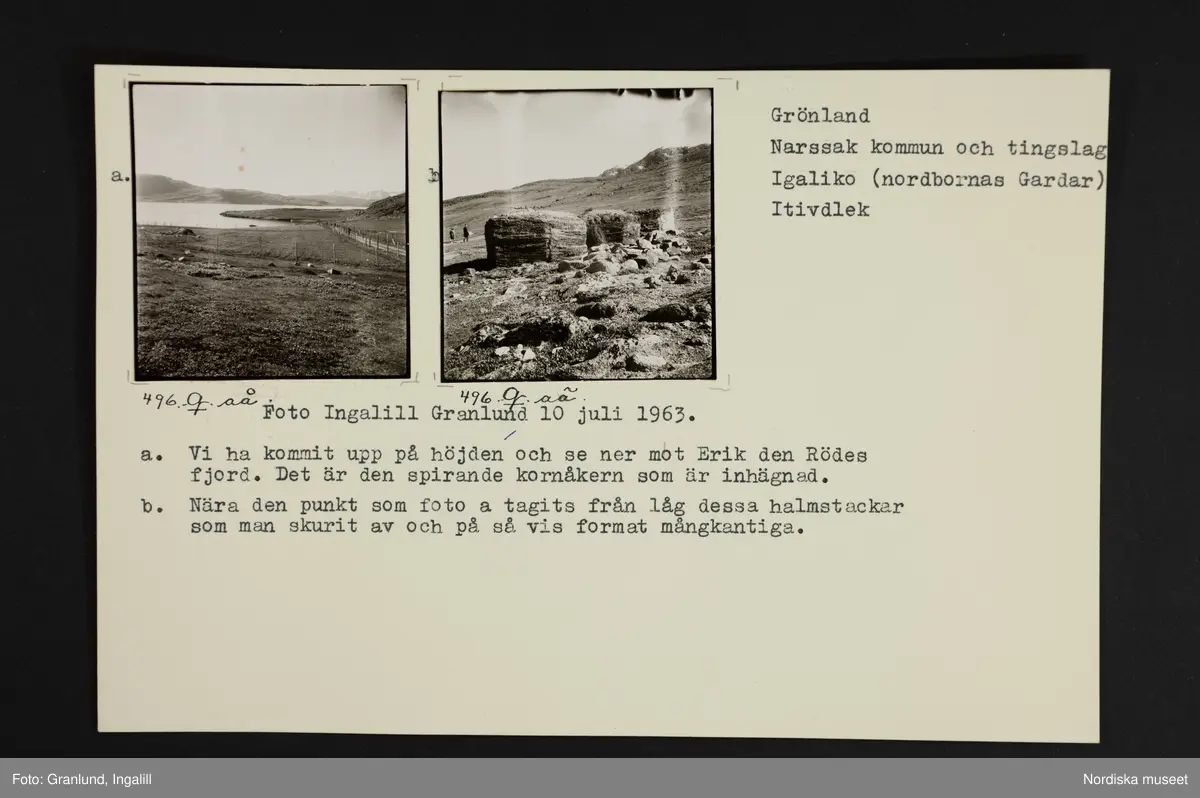 Ark med två monterade foton och text: "a. Vi ha kommit upp på höjden och se ner mot Erik den Rödes fjord. Det är den spirande kronåkern som är inhängnad.