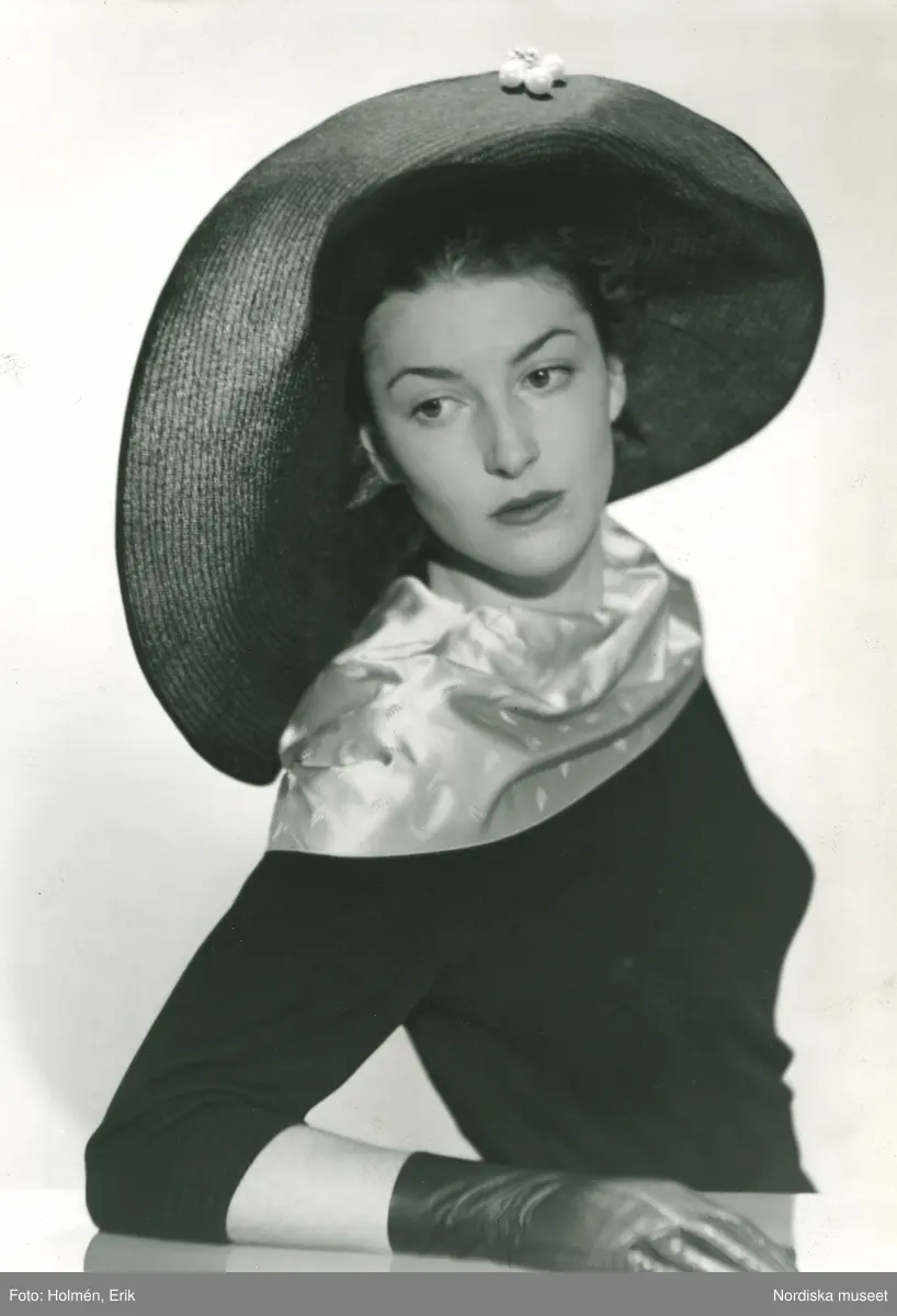 Porträtt av kvinna i bredbrättad stråhatt.