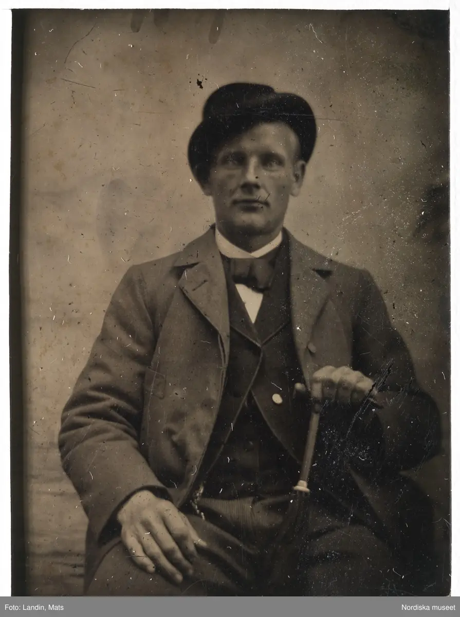 Mansporträtt. Ferrotyp, fotografisk bild på järnplåt, utan montering. Porträtt av man, knästycke, fas. Mannen tittar, något vindögt, rakt in i kameran. Iklädd ytterrock, rock, väst, vit skjorta med svart halsduk, randiga byxor och hatt. I bakgrunden något skrynklig enfärgad fond.