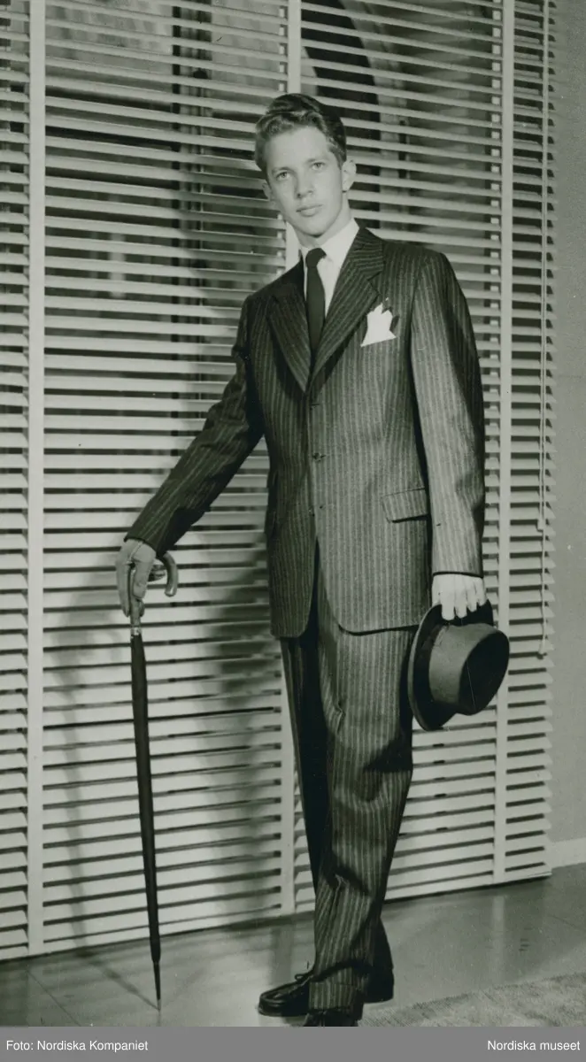 Ung man i randig kostym, vit skjorta och slips. I bröstfickan en näsduk, på händerna handskar. Paraply. Nordiska Kompaniet. Text med blyerts på baksidan: "Tonårsmodet oktober -53"