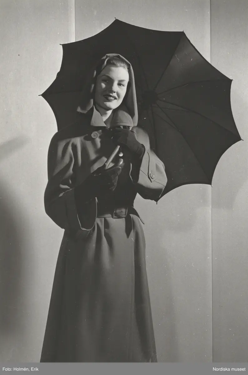 Nordiska Kompaniet. Kvinna i mörk kappa med kapuschong och uppfällt paraply. Text på baksidan: "NK mars 1950"
