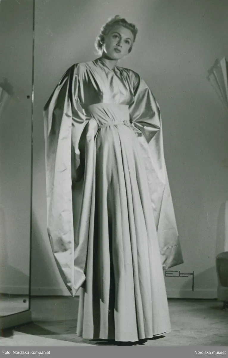 Mannekängen Anita Sandin i klänning med lång kjol och sidenöverdel, mycket vida ärmar från Jacques Fath, NK:s Franska damskrädderi.
