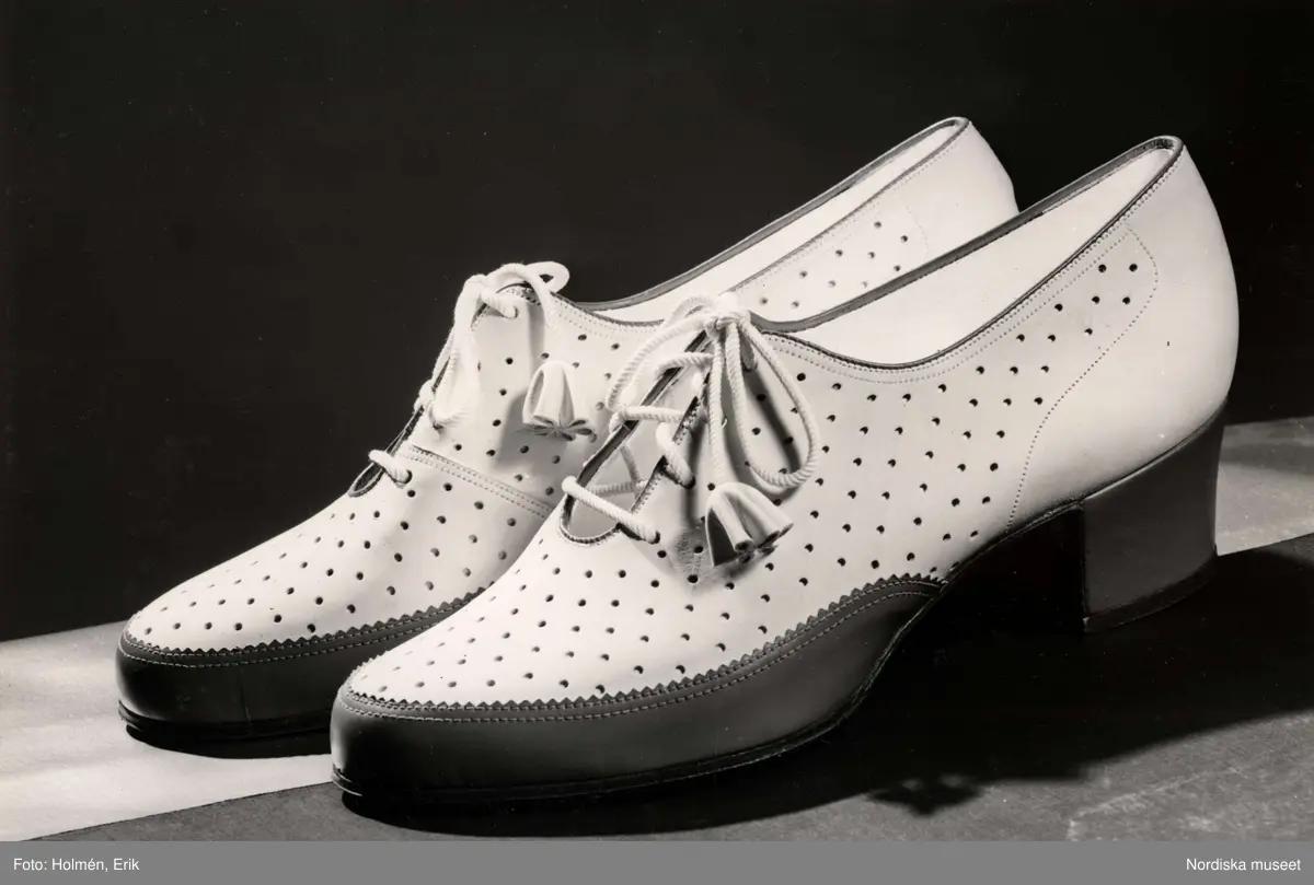 Skomode visas på Nordiska Kompaniet 1941. Ett par ljusa damskor med halvhög klack, perforerat hålmönster och knytning.