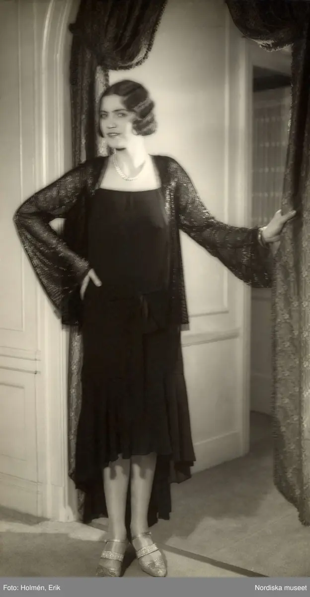 Mannekäng vid provrummet på NK:s Franska damskrädderi klädd i svart chiffongklänning med lös pärbroderad ljacka. Originalmodell från Coco Chanel.