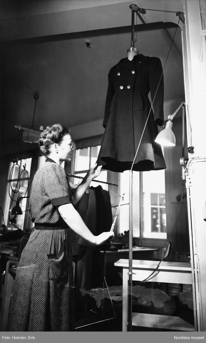 Interiör från E-sektionen på Nordiska Kompaniet. Kvinna i prickig klänning hissar en mörk, dubbelknäppt kappa på en provdocka.