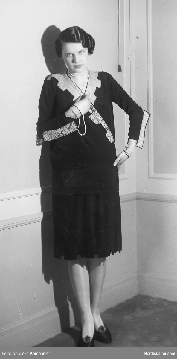 Modell i svart kjol och tröja med infällda, cremefärgade spetsar, samt pärlhalsband.