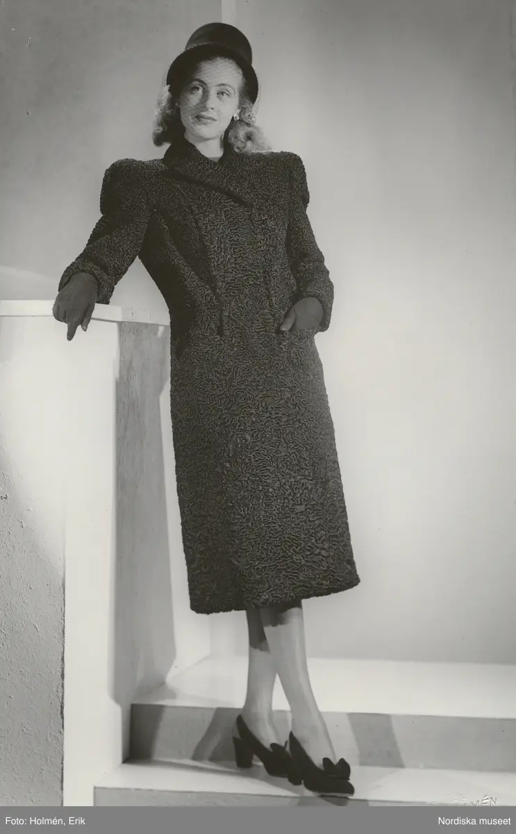 Nordiska Kompaniet. Kvinna i mörk päls (persian?) och svart hatt med flor. Text på baksidan: "Arkivbild d. 21/8 45"