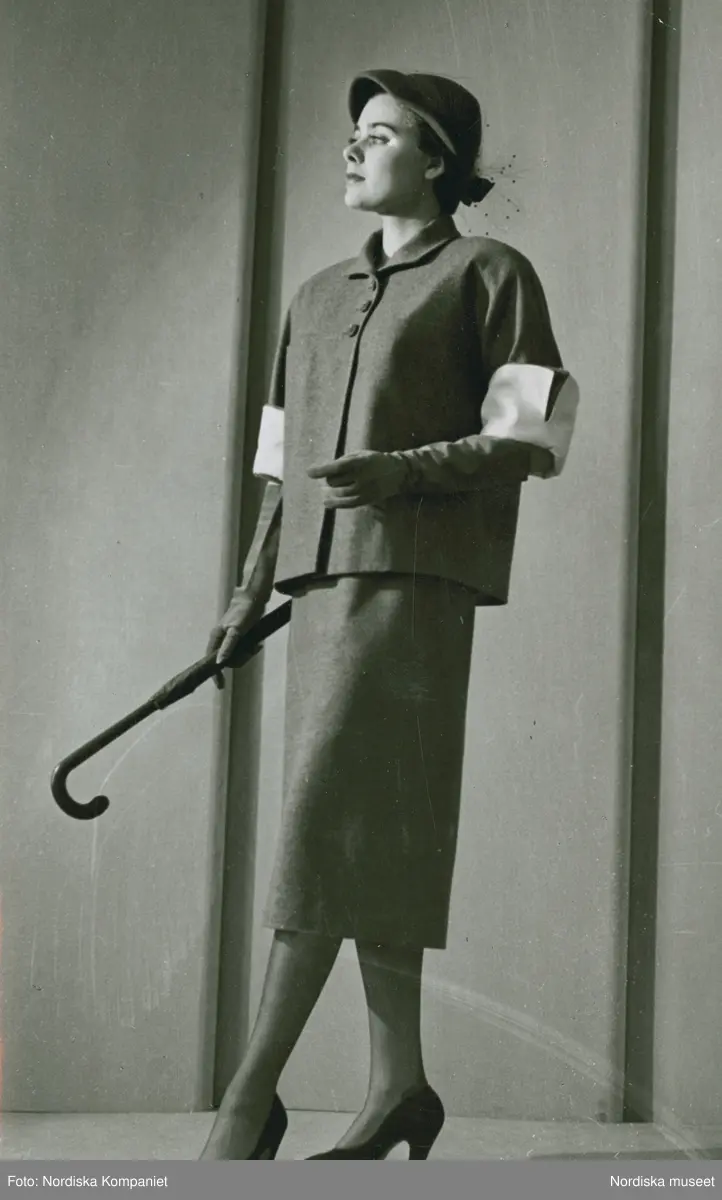 Mannekäng, möjligen Gerd Hystad, i dräkt, hatt dekorerad med flor med moucher, handskar, pumps och paraply i handen. Från Lanvin. NK:s Franska damskrädderi.