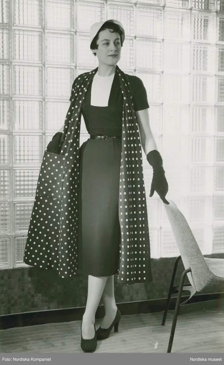 Modell i klänning, prickig sjal, hatt, handskar och pumps, framför betongglas, vid en fåtölj. Modellbutiken.