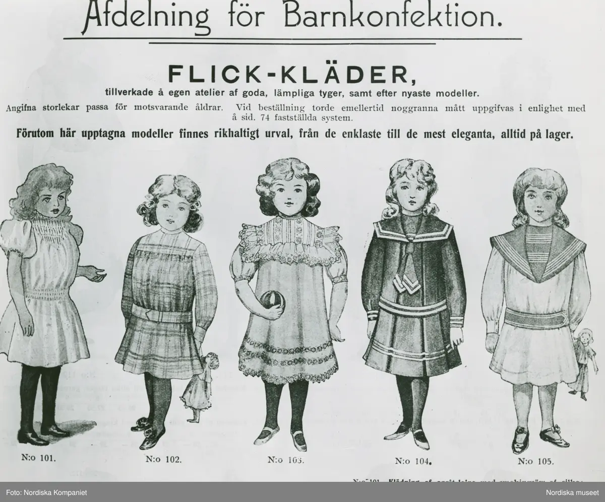 K.M Lundberg - katalog. "Flick-kläder tillverkade å egen atelier af goda, lämpliga tyger, samt efter nyaste modeller." Fem olika klänning-modeller.