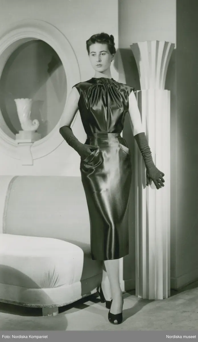 Modell i klänning, aftonhandskar och högklackade skor, vid soffa och spegel. Original från Balmain.