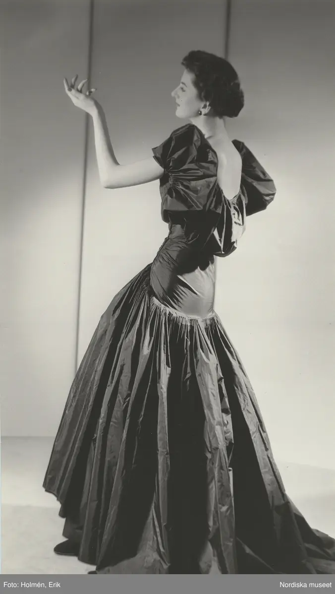 Modell poserar i hellång aftonklänning med puffärmar. Madame Grès.
