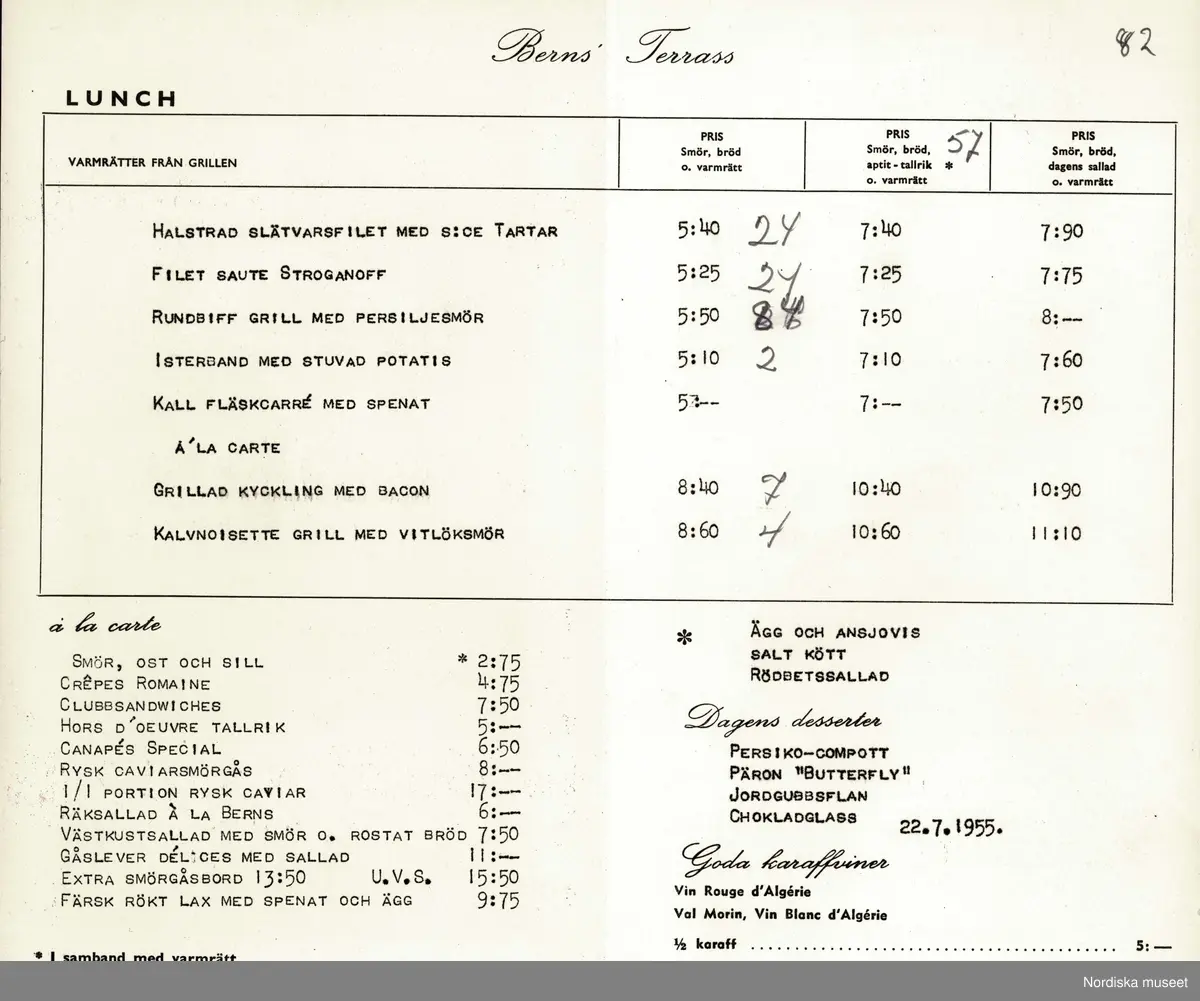 Matsedel från Berns restauranger. 22/7 1955. Insidan.
