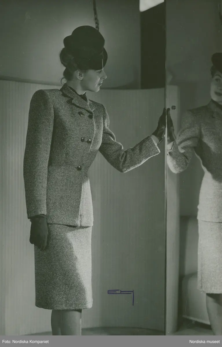 Modell i dräkt, hatt och handskar vid en spegel, från Molyneux.