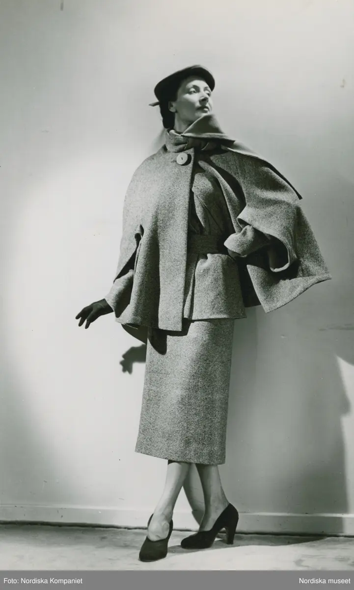 Modell i ylledräkt med capejacka, hatt och pumps, av Jacques Griffe.