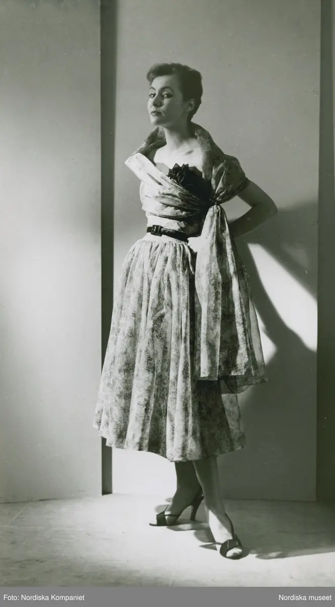 Modell i mönstrad klänning, skärp och sjal. Från Balenciaga.