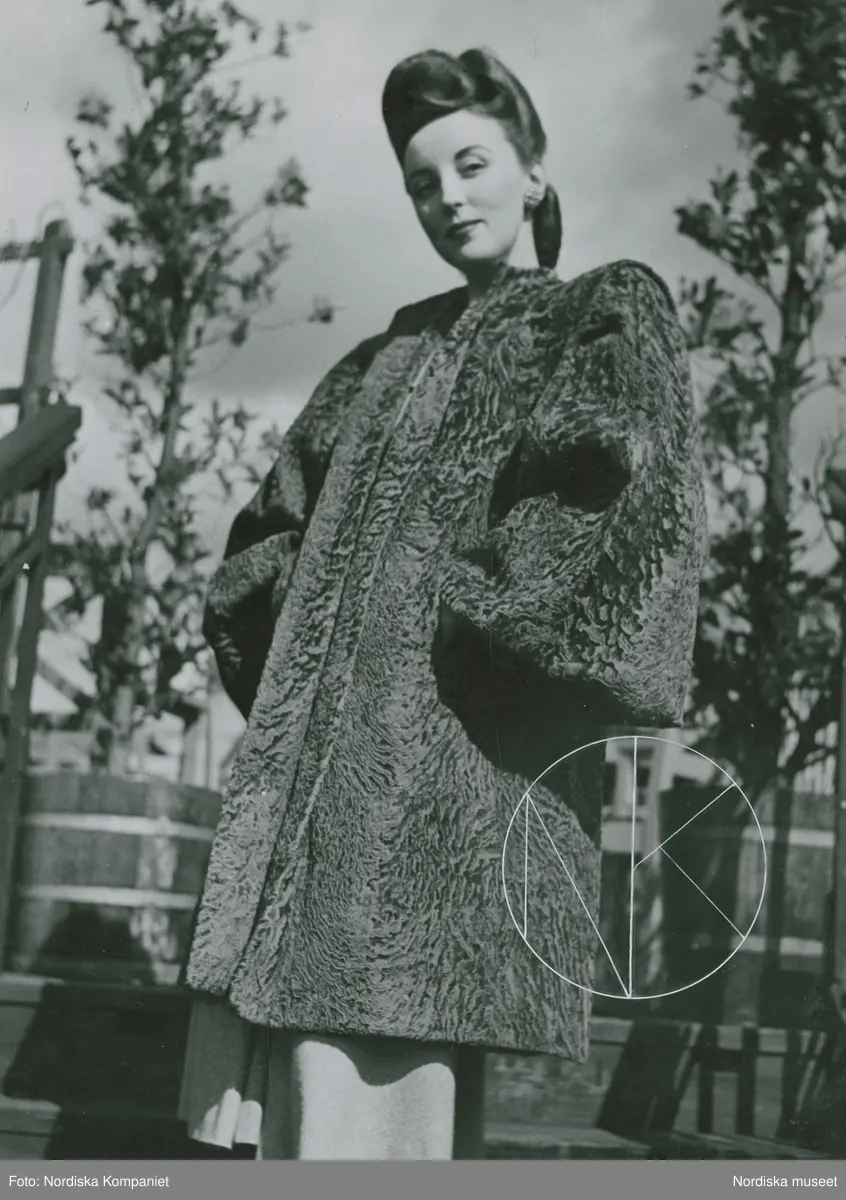 Modell i amerikansk päls och håruppsättning, på en trappa.