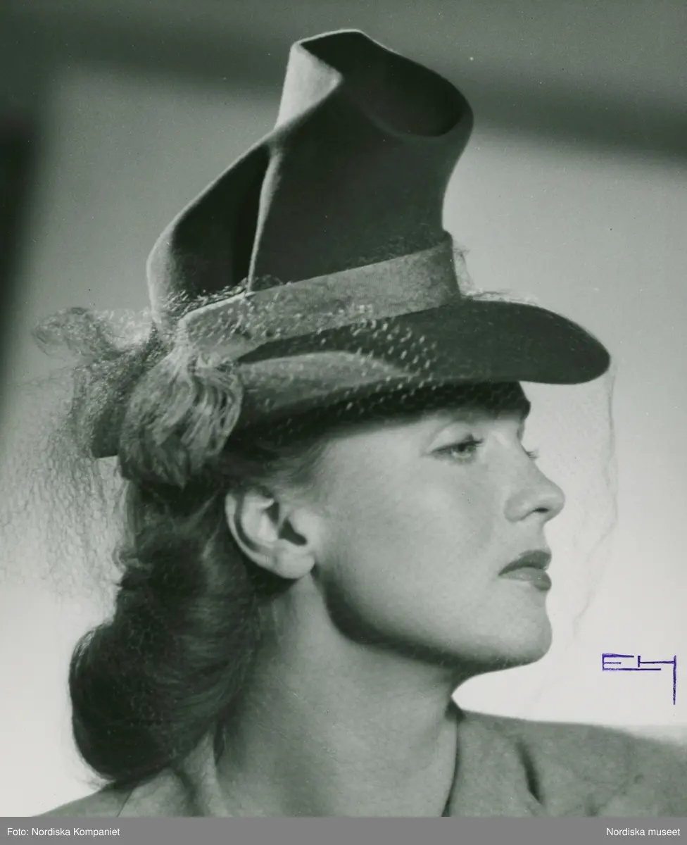 Modell i hatt med hög kulle, brätte, flor, hattband.
