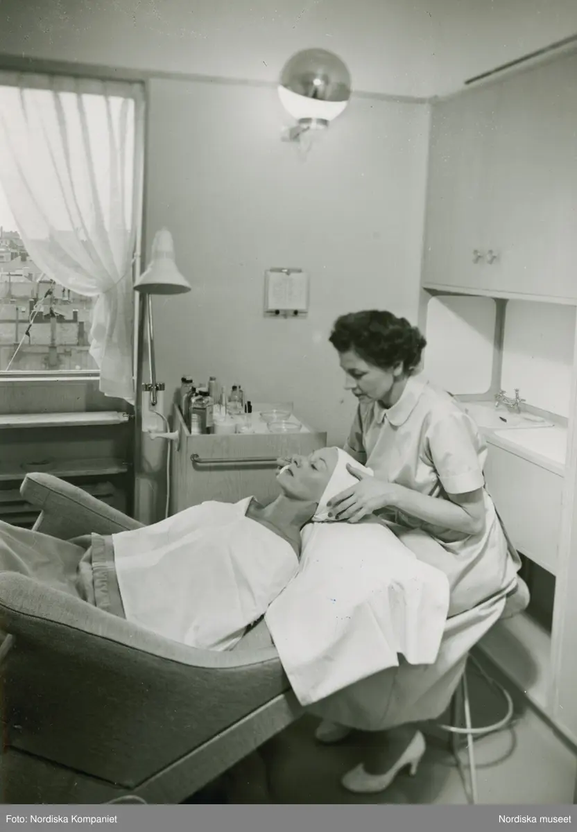 Ansiktsvård. En kvinna får en handduk lagd över pannan. Nordiska Kompaniet.