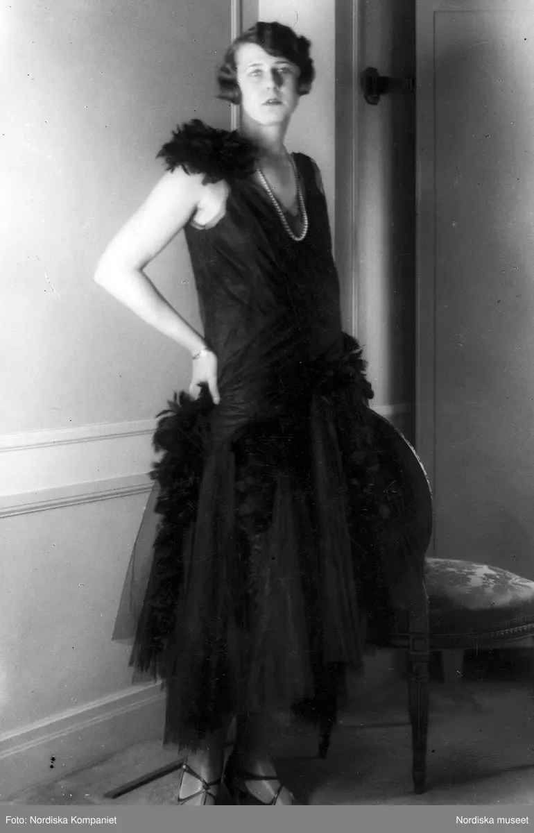 Modell i svart, assymetriskt skuren klänning med fjädrar.