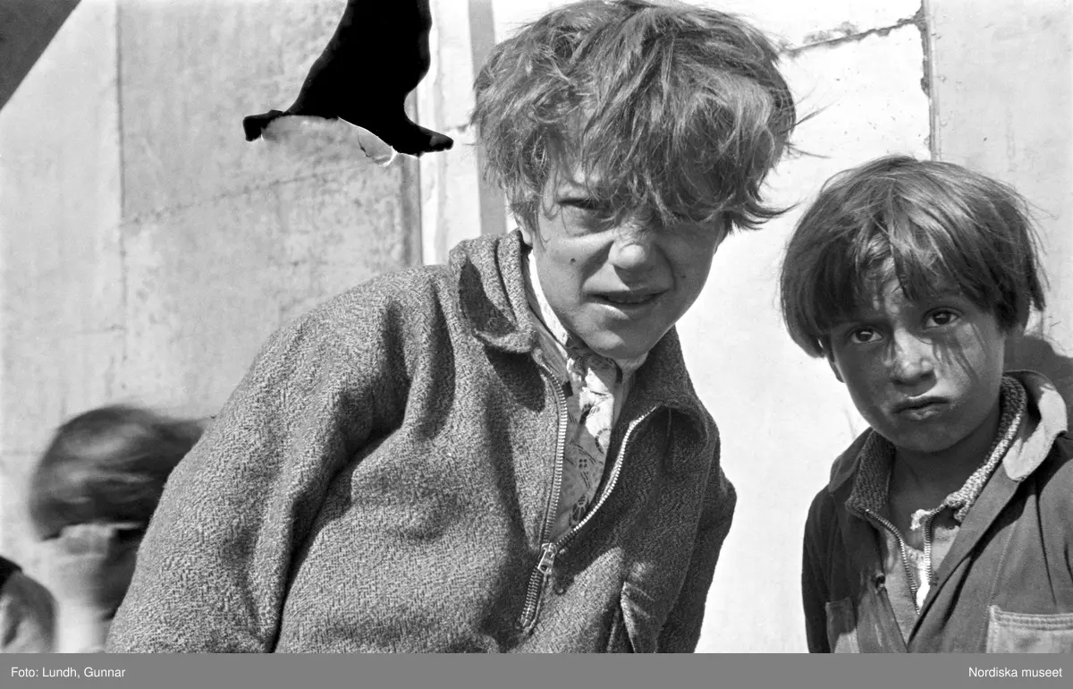 Porträtt av två pojkar som ser in i kameran. Den ene med ett snett leende, den andre allvarlig. Familjen Taikons läger i Johanneshov, södra Stockholm.