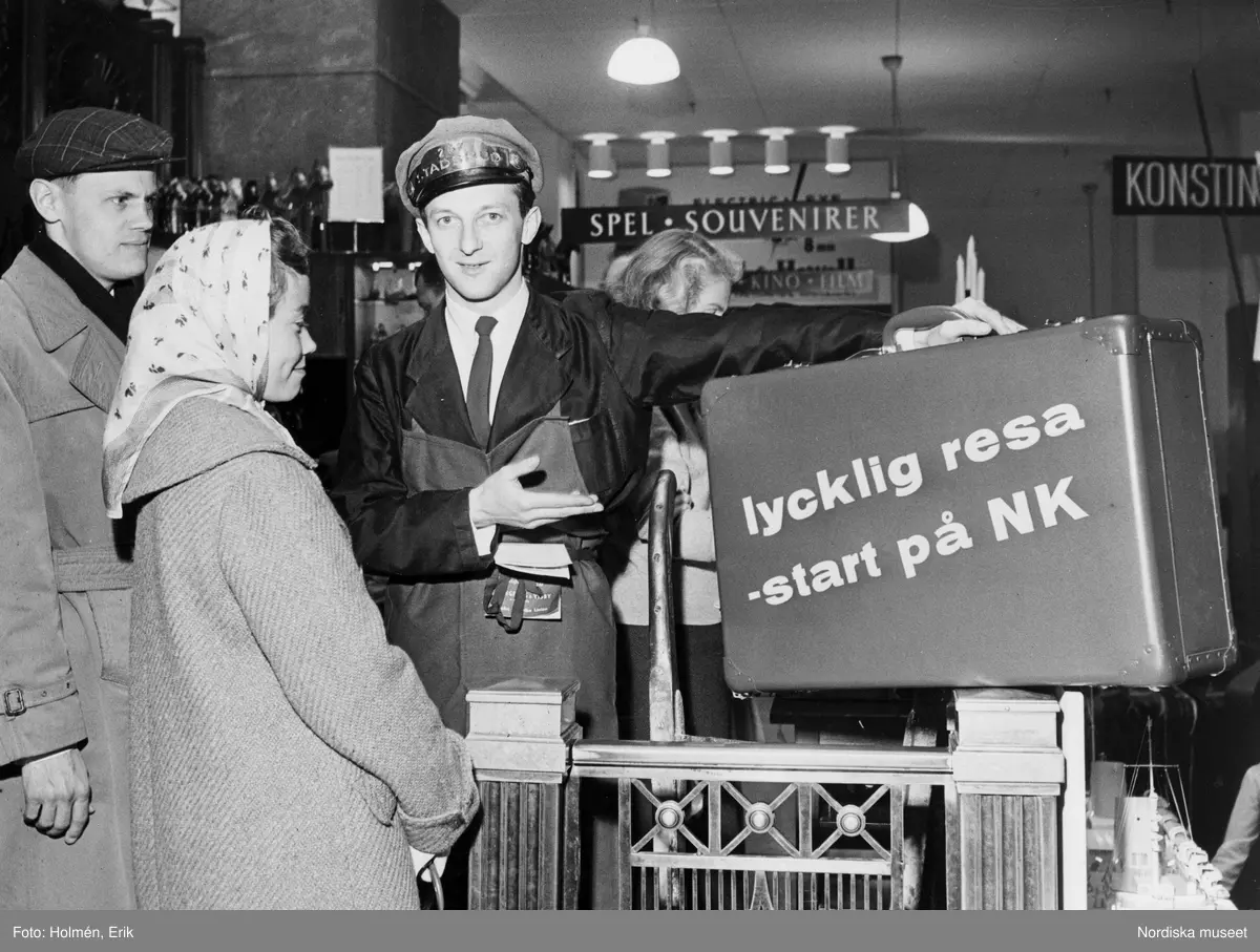 Butiksbiträde visar upp resväska för två kunder på Nordiska Kompaniet. "Lycklig resa - Start på NK."