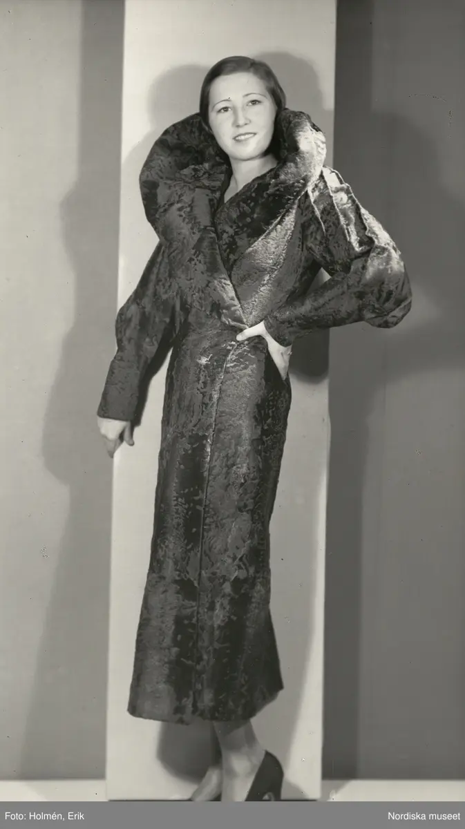 Nordiska Kompaniet. Kvinna i mörk pälskappa med hög och bred krage. Sannolikt breitschwantz.