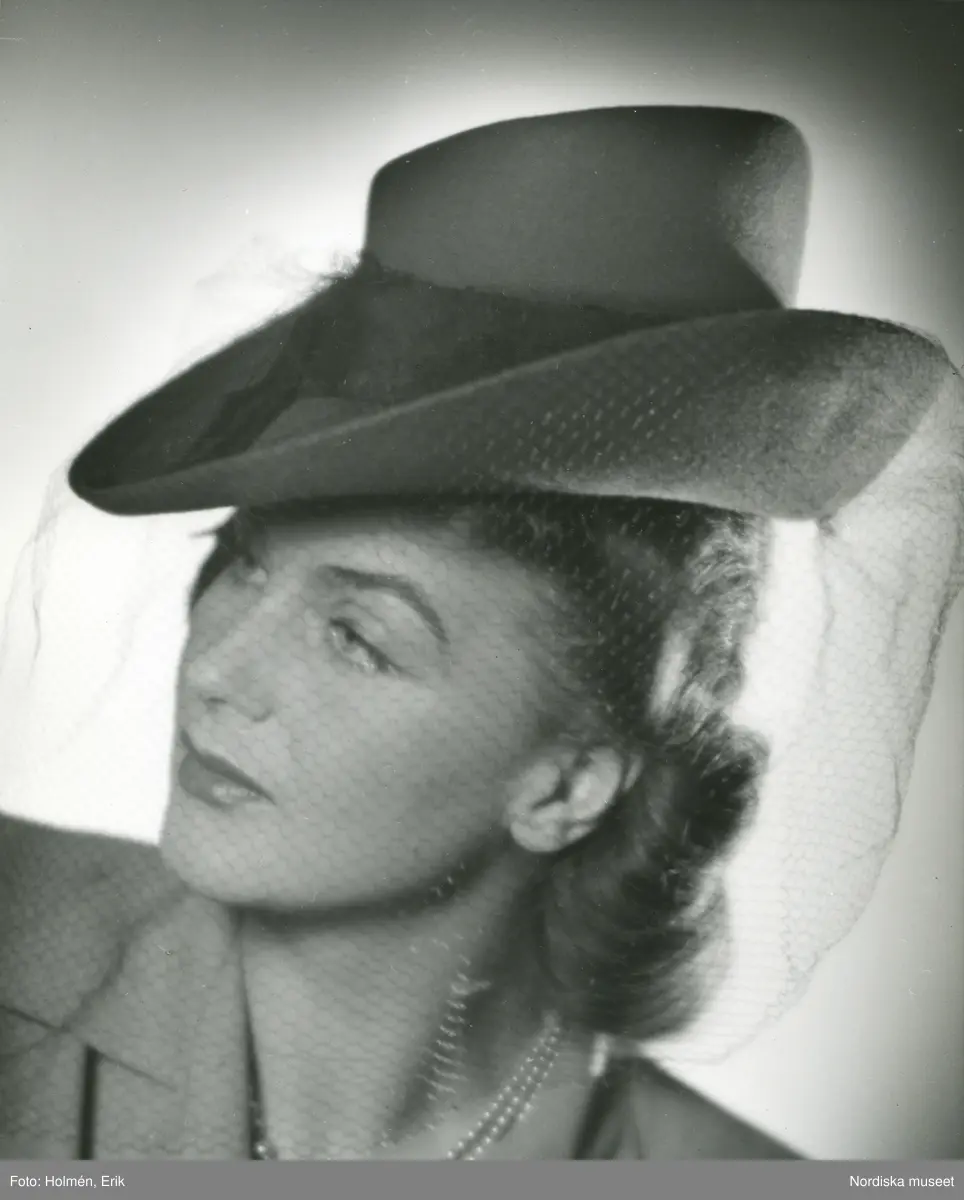 Porträtt av kvinna i hatt med flor, hattband och uppvikt brätte.