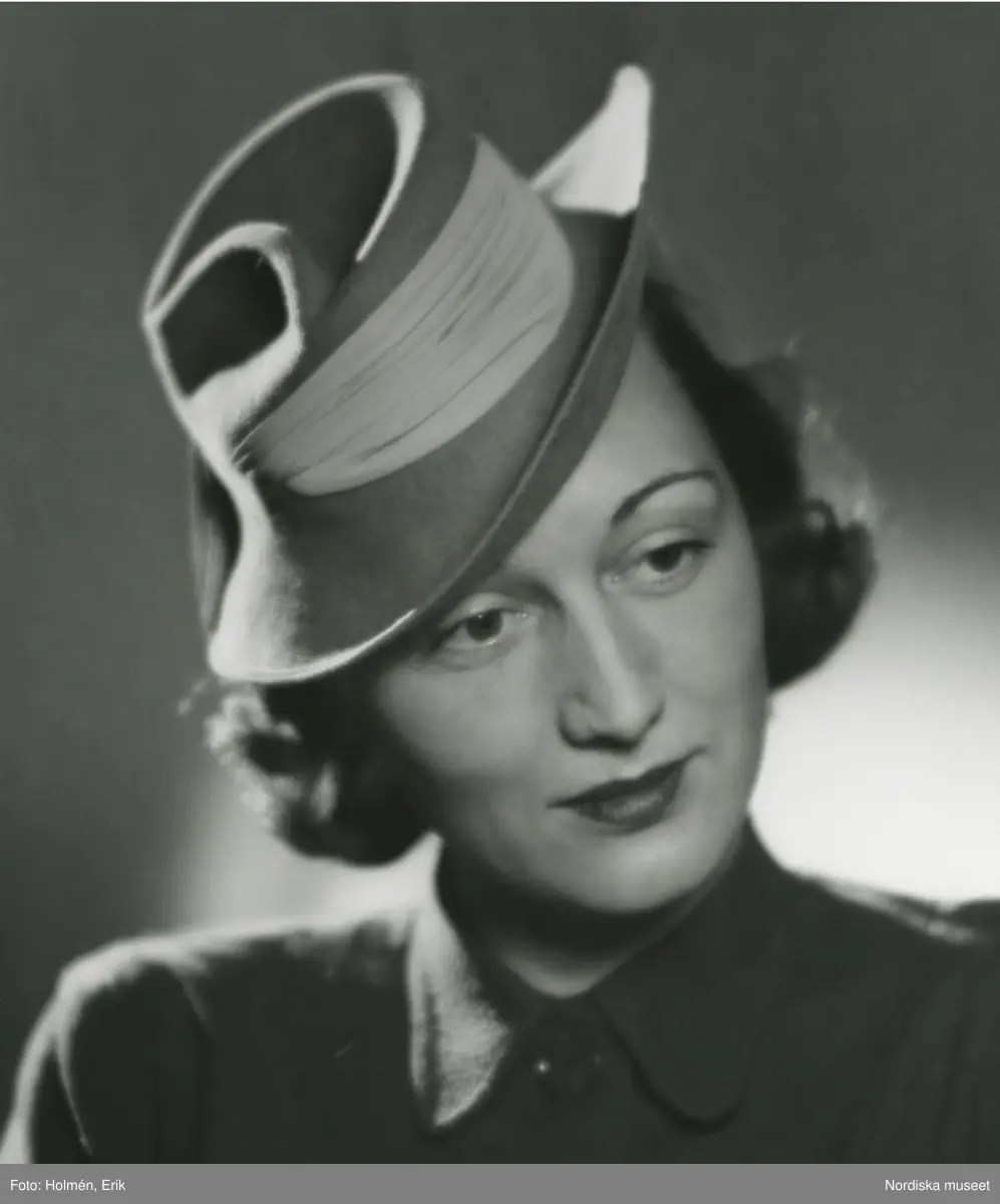 Porträtt av kvinna i hatt med ljust dekorband.