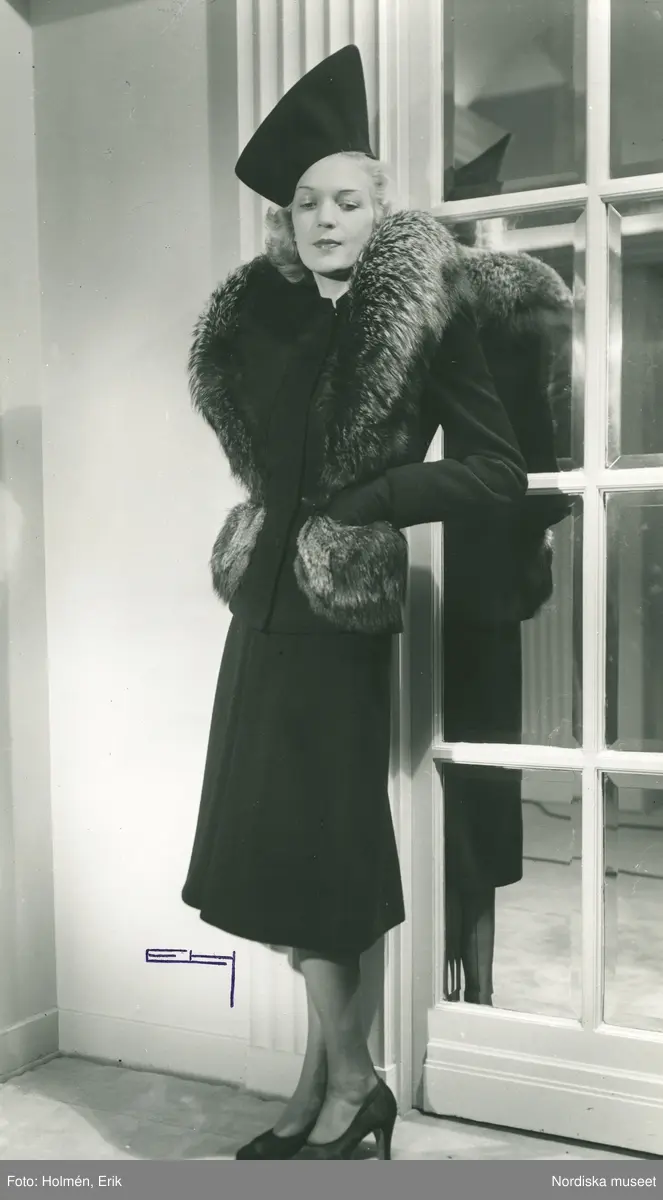 Helporträtt av modell klädd i dräkt av duvetin med garnityr av silverräv, samt hatt. Design av Joe Strassner.