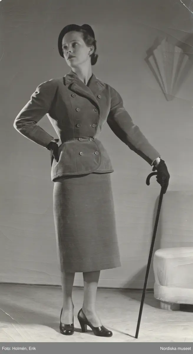 Modell i dräkt, hatt, pumps och käpp i handen.