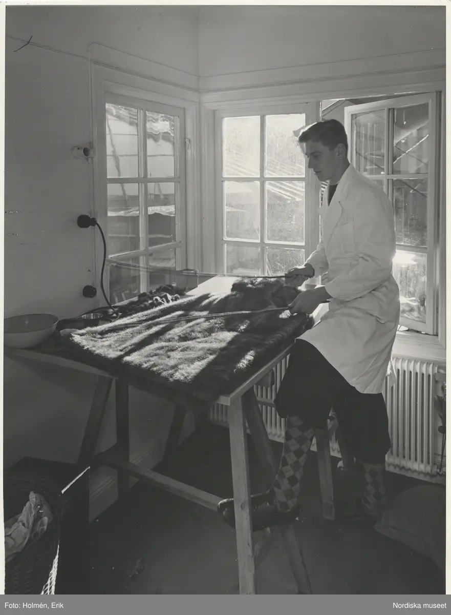 I pälsateljén. Man i vit arbetsrock och golfbyxor arbetar med päls.