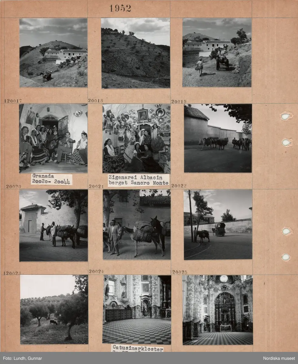 "Genom Puerte Mora i Sierra Nevada till Granada 20013 - 20019", landskapsvy med bebyggelse och berg, en man med hästar med bebyggelse och berg i bakgrunden, "Granada 20020 - 20044", interiör med en grupp kvinnor troligen dansare och två män som spelar gitarr, "Zigenarei Albacin berfet Sancro Monte, interiör med en grupp kvinnor, åsnor och en grupp män går på en väg, landskapsvy med betande kor och olivlundar, Catusinerkloser 20027 - 28" (Kartusianskt kloster), interiör av en kyrka med altare.