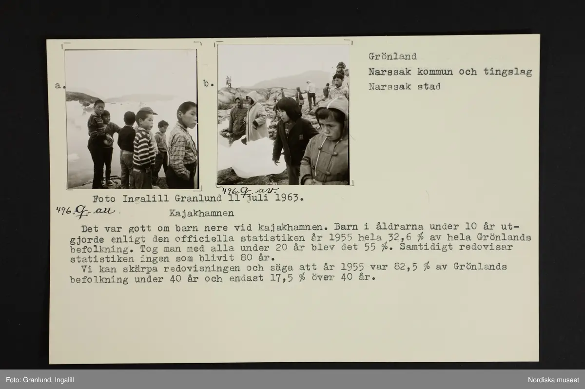Ark med två monterade foton och text: "Kajakhamnen. Det var gott om barn nere vid kajakhamnen. Barn i åldrarna under 10 år utgjorde enligt den officiella statistiken år 1955 hela 32,6 % av hela Grönlands befolkning. Tog man med alla under 20 år blev det 55 %. Samtidigt redovisar statistiken ingen som blivit 80 år.