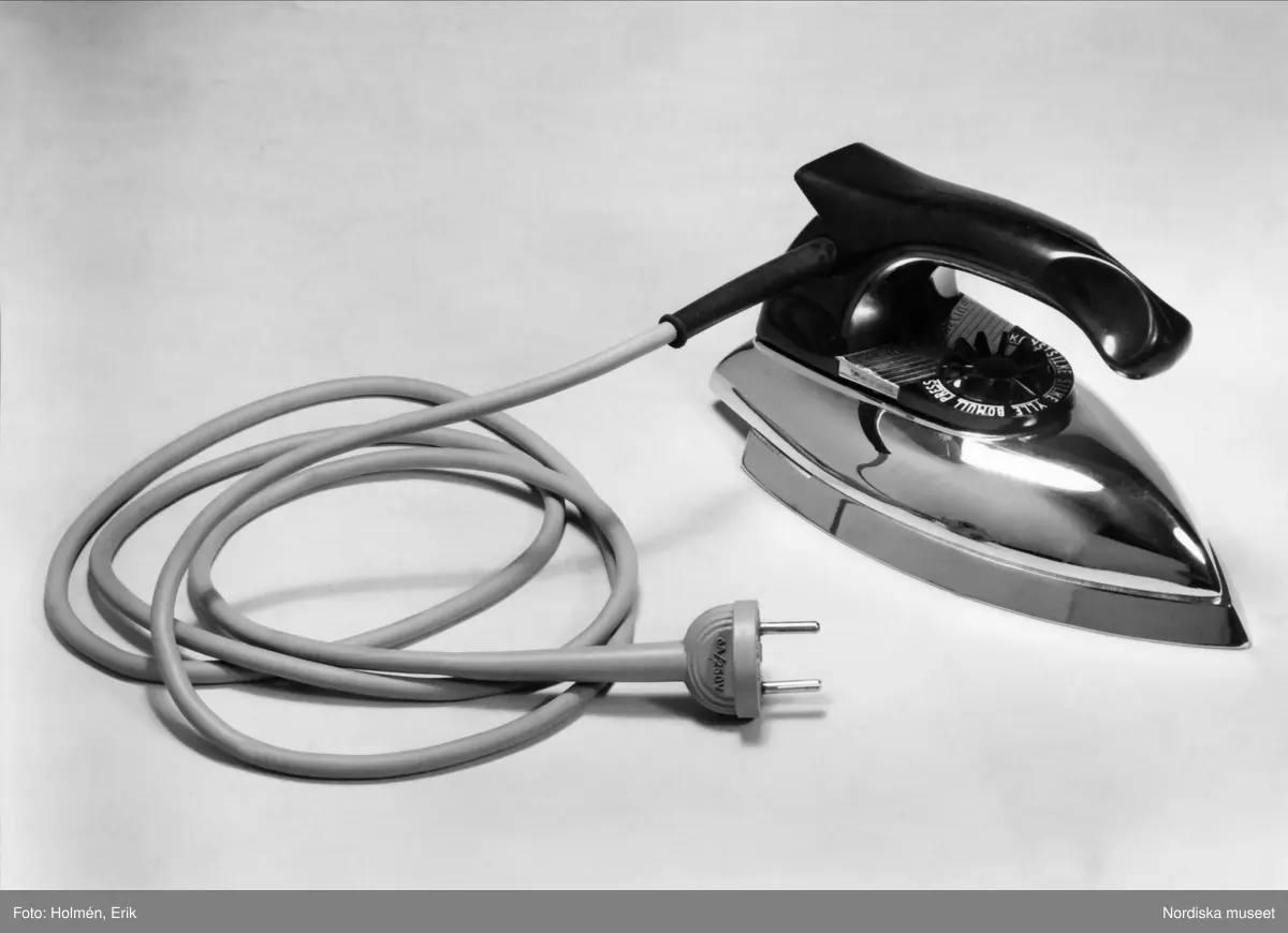 Nordiska Kompaniet. "Termostatstrykjärn för växelström med öppet handtag - härigenom kommer man lättare åt att stryka ärmar och ärmholkar. Bekvämt tumgrepp för både höger och vänster hand. Helgjuten sladd. Effekt 700 Watt. Vikt 1,9 kg. På Nk. Pris 39:-".