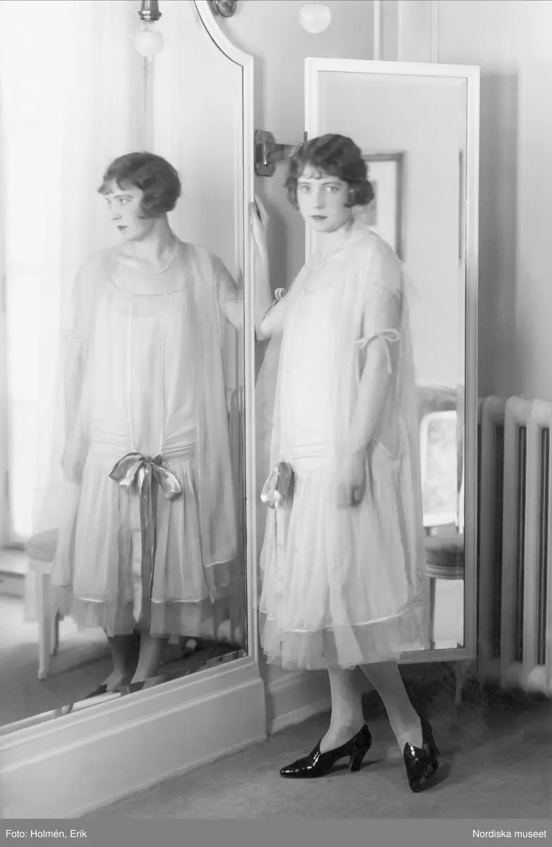 Modell i aftonklänning framför spegel. Nordiska Kompaniet.